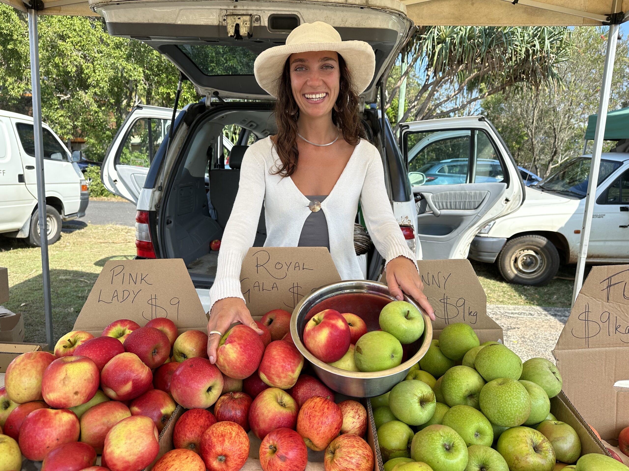 Vanessa – favourite apple Pink Lady – has a wide white smile which dazzles each of the steady troop of customers who come to buy apples. For three years she’s been there, selling the Pink Ladies and Granny Smiths and the rough-and -ready juicing apples produced at the McMahon family orchard up near Stanthorpe, certified organic apples devoid of waxes and sprays, picked just within days of going to market themselves. ‘People’, she tells me, ‘know me as the Apple Lady – it’s so sweet!’